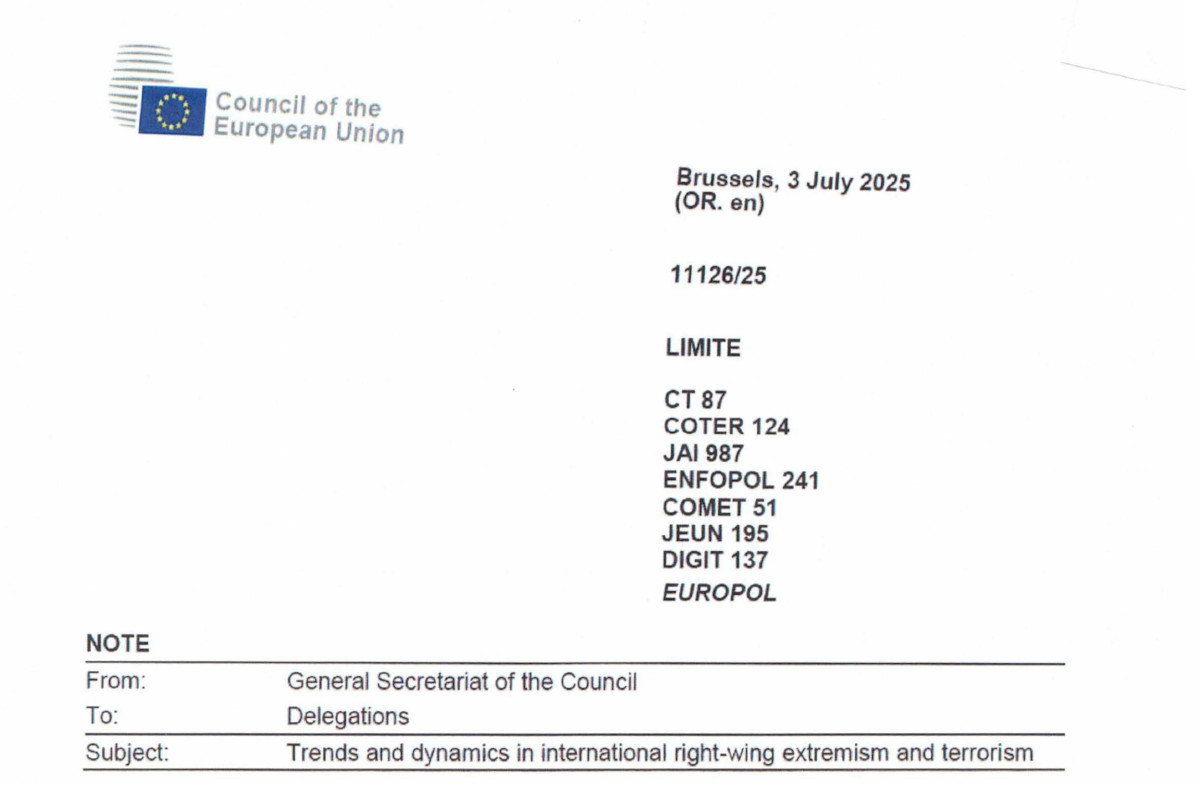 A document circulated in the Council of the EU in early July on the issue of international right-wing extremism and terrorism. The note says: "Transnational links between foreign VRWE groups are increasing, with the phenomenon of accelerationism posing the most concerning threat."