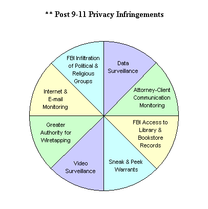 Anderson also notes that, Unfortunately, data surveillance is a just a slice in the pie of post 9-11 privacy infringements. (See Graphic below)** Since the terrorist attacks, the FBI has relaxed its guidelines for infiltrating political and religious groups. Moreover, because of USA PATRIOT Act sections 216 and 217, investigators have greater authority to monitor e-mail and internet use. These provisions have encouraged the FBI to further implement its Carnivore Internet Communications System, which the agency renamed DCS 1000 after public abhorrence to the name Carnivore.